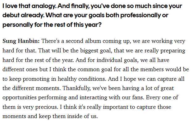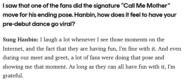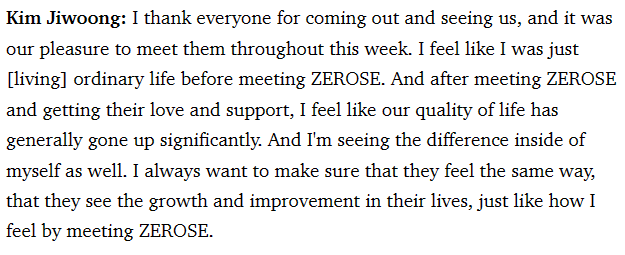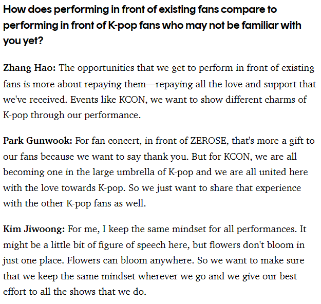아직 당신이 익숙하지 않을 수도 있는 케이팝 팬들 앞에서 공연하는 것은 기존 팬들 앞에서 공연하는 것과 비교하면 어떤가요? 장하오: 기존 팬들 앞에서 공연할 수 있는 기회는 그들에게 보답하는 것에 더 중점을 두고 있습니다. 우리가 받은 모든 사랑과 응원에 보답하는 것입니다. KCON과 같은 행사들을 통해 우리의 공연으로 색다른 K-pop의 매력을 보여주고 싶습니다. |