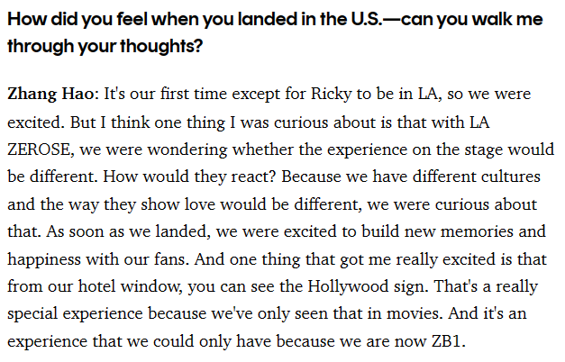 | How did you feel when you landed in the U.S.—can you walk me through your thoughts? Zhang Hao: It's our first time except for Ricky to be in LA, so we were excited. But I think one thing I was curious about is that with LA ZEROSE, we were wondering whether the experience on the stage would be different. How would they react? Because we have different cultures and the way they show love would be different, we were curious about that. As soon as we landed, we were excited to build new memories and happiness with our fans. And one thing that got me really excited is that from our hotel window, you can see the Hollywood sign. That's a really special experience because we've only seen that in movies. And it's an experience that we could only have because we are now ZB1. |